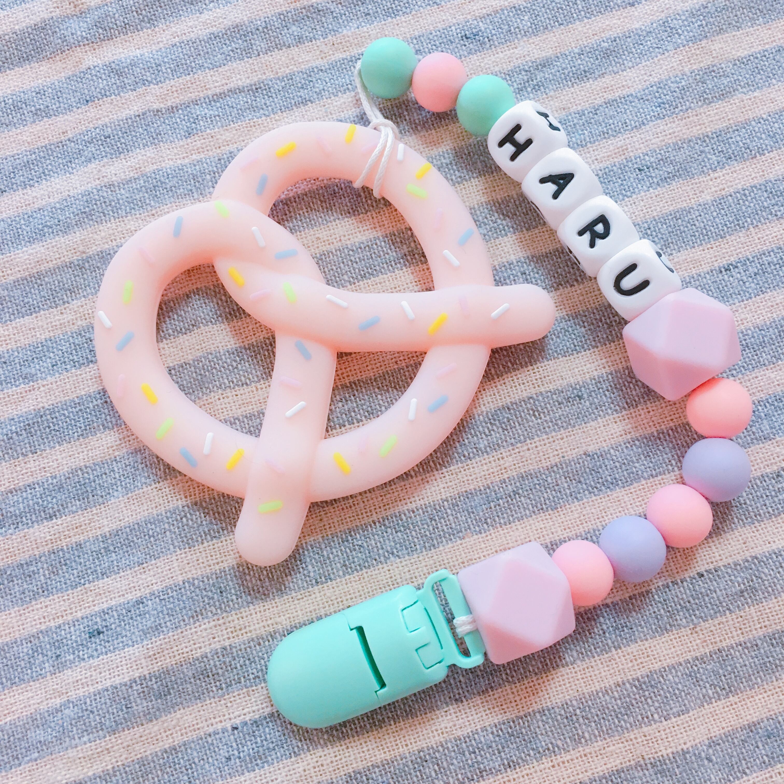 出産祝い、百日祝い、ハーフバースデーのプレゼントにぴったりの、名入れ歯がためおもちゃ^ ^